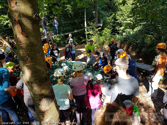 Am Morgen des 24.09.2022 versammelten sich circa 30 Teilnehmer am Kletterwald in Plochingen, um aufregende und fröhliche Stunden in den Baumwipfeln verbringen zu können. Das Wetter war gnädig und so kamen nur einzelne Tropfen vom Himmel, welche es nicht durch die dichten Blätter schafften. Nach einer Einführung musste zunächst ein kleiner Übungskurs absolviert werden, um sich mit dem Klettergurt und der Sicherung vertraut zu machen. In mehreren Gruppen aufgeteilt, startete man hoch motiviert und sehr neugierig in die Parcours. Es wurde geklettert, gehangelt, balanciert, auch gezittert und gebibbert. So ging die Kletterzeit schnell vorbei und alle Teilnehmer waren ordentlich hungrig und ausgepowert, aber auch zufrieden über den Kletterspaß, am Ende der Veranstaltung. Vielen Dank an al ... Mehr erfahren
